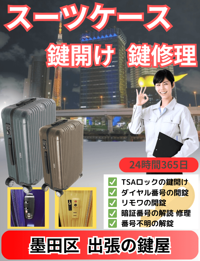 TSAロックの開錠、ダイヤル錠の開錠、番号錠の開錠、暗証番号錠の開錠、ダイヤルロックの開錠、リモワの鍵開け、磁石錠の開錠、カード錠の開錠などスーツケースの鍵開けや鍵修理に錦糸町に駆け付けますのでお困りの際はお気軽にご相談ください。